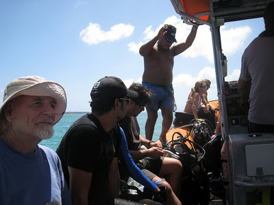 Harry is standing in the back as the boat leaves the Saipan shoreline, but he had to move around a bit to avoid the spray. Robert didn't move, so he was soaked by the time we got to the site. It looked like he'd already been diving.